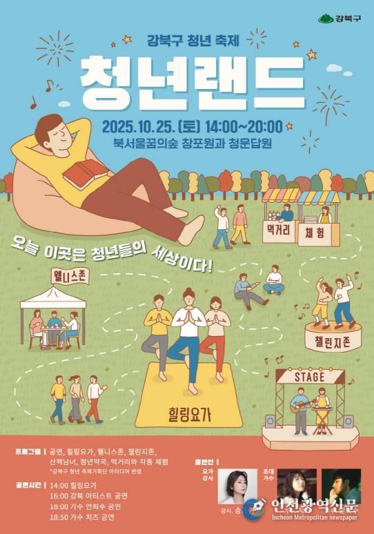 [인천광역신문] 최훈 기자 | 강북구는 오는 10월 25일 북서울꿈의숲에서 열리는 제2회 강북구 청년축제 ‘청년랜드’의 주요 프로그램인 △힐링요가 △웰니스존 △산책남녀의 참여자를 9월 22일(월)부터 사전 모집한다.