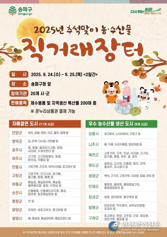[인천광역신문] 최훈 기자 | 송파구는 민족 최대 명절 추석을 맞아 오는 9월 24일과 25일 이틀간 구청 앞에서 ‘추석맞이 농·수산물 직거래장터’를 운영한다고 밝혔다.