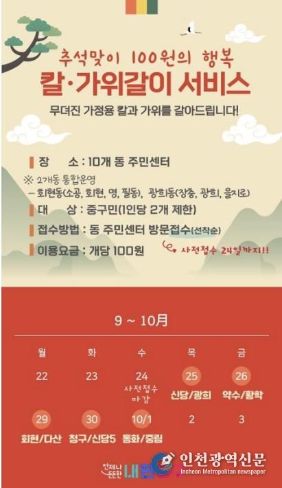 [인천광역신문] 최훈 기자 | 서울 중구가 오는 25일부터 10월 1일까지 동을 순회하며 ‘찾아가는 칼·가위갈이 서비스’를 운영한다. 음식 준비로 칼과 가위 사용이 잦아지는 추석 명절을 맞이해, 중구가 고향사랑기금으로 마련한 생활밀착형 서비스다.