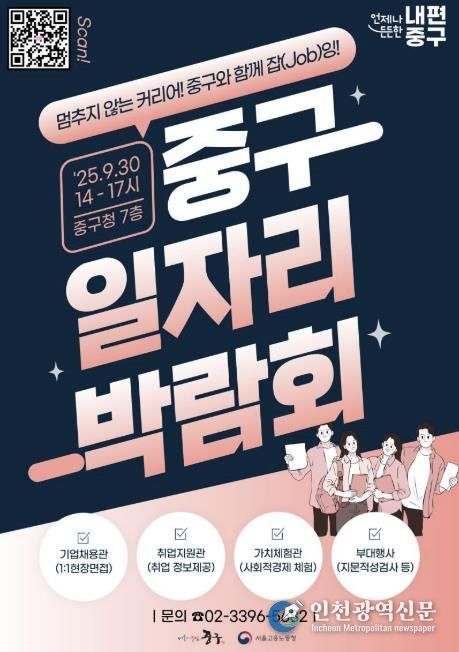 [인천광역신문] 최훈 기자 | 서울 중구가 오는 30일 오후 2시부터 5시까지 중구청 7층 대강당에서 '2025 중구 일자리박람회'를 개최한다.