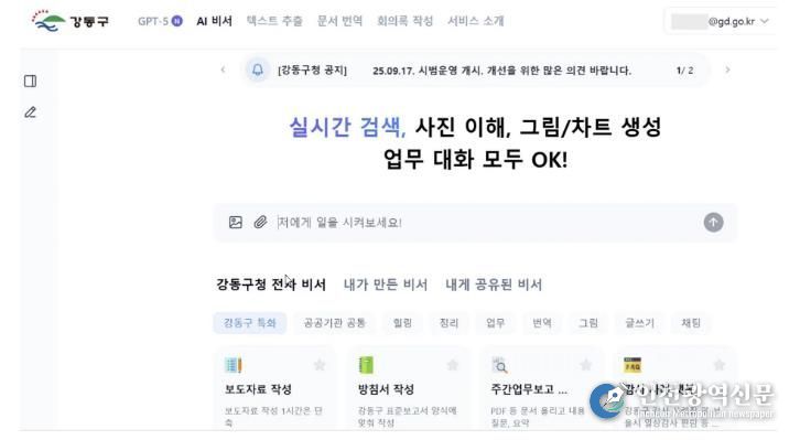 ‘생성형 AI 업무 지원 서비스’는 강동구가 최신 생성형 인공지능(AI) 모델인 GPT-5을 기반으로 다양한 실무에 적용할 수 있도록 구축한 통합 플랫폼이다.
