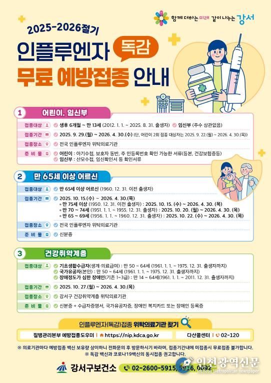 [인천광역신문] 최훈 기자 | 서울 강서구가 오는 9월 22일부터 내년 4월 30일까지 인플루엔자 백신 무료 예방접종을 실시한다고 밝혔다.