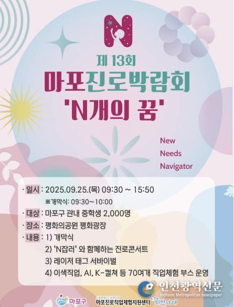 제13회 마포진로박람회 ‘N개의 꿈’은 청소년이 스스로 미래를 설계하고 가능성을 확장한다는 의미로 New(새로운 경험), Needs(청소년이 바라는 꿈과 진로), Navigator(꿈을 향한 길잡이)라는 메시지를 담았다.