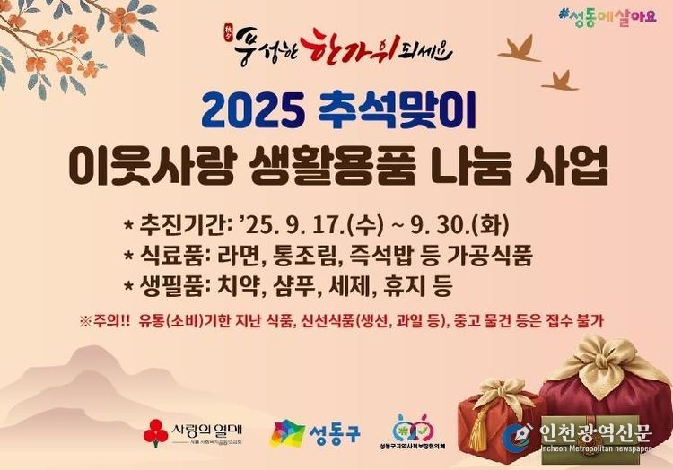 [인천광역신문] 최훈 기자 | 서울 성동구는 소외된 이웃 없이 모두가 훈훈한 추석 명절을 보낼 수 있도록 생활용품 및 식료품을 기부받아 어려운 이웃에게 전달하는 ‘추석맞이 이웃사랑 생활용품 나눔 사업’을 오는 9월 30일까지 추진한다고 밝혔다.
