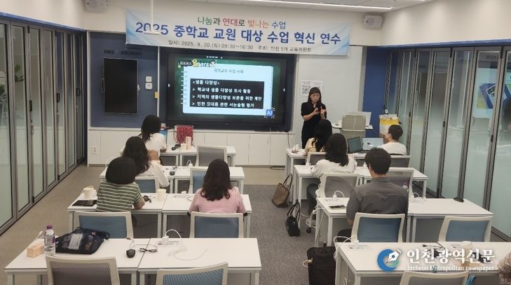 [인천광역신문] 최예준 기자 | 인천광역시교육청은 20일 제물포AI융합교육센터에서 관내 5개 교육지원청 주관으로 ‘2025 중학교 교원 대상 수업혁신 연수’를 운영했다고 밝혔다.