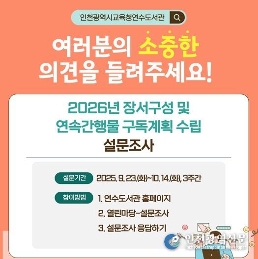 [인천광역신문] 최예준 기자 | 인천광역시교육청연수도서관은 9월 23일부터 3주간 ‘2026년 장서 구성 및 연속간행물 구독 계획 수립’을 위한 설문조사를 진행한다.