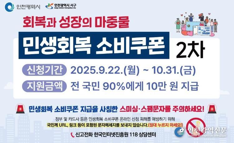 [인천광역신문] 최예준 기자 | 인천 서구는 22일 민생회복 소비쿠폰 2차 신청 접수와 함께 불분명한 인터넷주소(URL, 링크 등)가 포함된 의심 문자에 각별히 주의해야 한다고 당부했다.
