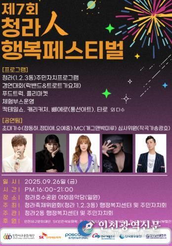 [인천광역신문] 최예준 기자 | 인천 서구 청라2동 행정복지센터는 오는 9월 26일 금요일 오후 4시부터 청라호수공원 야외음악당에서 ‘제7회 청라인 행복 페스티벌’을 개최한다고 22일 밝혔다.