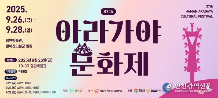 [인천광역신문] 관리자 기자 | 아라가야의 역사문화를 널리 알리기 위한 순수 역사문화축제인 ‘제37회 아라가야문화제’가 오는 9월 26일부터 28일까지 3일간 ‘세계유산, 말이산고분군에서 놀자!(Let’s Play at Marisan World Heritage Tombs!)’라는 주제로 함안박물관과 말이산고분군 일원에서 열린다.