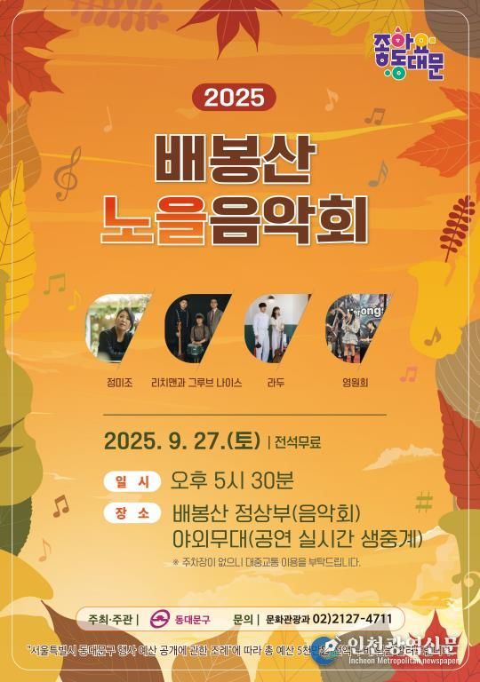 [인천광역신문] 최훈 기자 | 서울 동대문구는 오는 27일 ‘2025 배봉산 노을음악회’를 개최한다고 밝혔다. 올해 첫선을 보이는 이번 음악회는 동대문구의 대표 명소인 배봉산 정상에서 열린다. 저무는 노을과 함께 재즈와 보사노바의 아름다운 선율을 즐길 수 있는 야외공연으로, 관객들에게 한층 더 깊고 감성적인 가을 저녁을 선사할 예정이다.