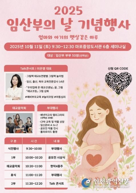 [인천광역신문] 최훈 기자 | 마포구는 임산부의 날을 맞아 오는 10월 11일 토요일 오전 9시 30분, 마포중앙도서관에서 열리는 ‘엄마와 아기의 햇빛같은 하루’ 행사에 함께 할 마포구민 임신부와 배우자(가족) 총 50쌍(100명)을 모집한다.