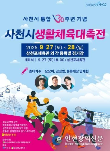 [인천광역신문] 관리자 기자 | 사천시는 시 통합 30주년을 기념해 오는 9월 27일부터 28일까지 이틀간 삼천포체육관 및 시 전역의 종목별 경기장에서 ‘사천시생활체육대축전’을 개최한다고 23일 밝혔다.