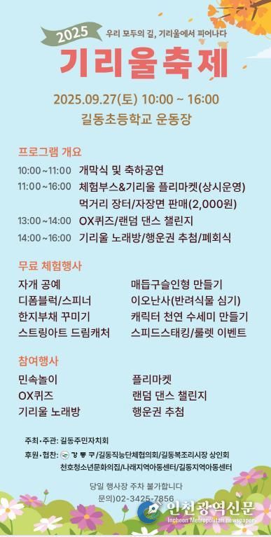 [인천광역신문] 최훈 기자 | 강동구 길동은 오는 27일 10시부터 16시까지 길동초등학교 운동장에서 주민 화합을 위한 ‘2025 기리울 축제’가 열린다고 밝혔다.