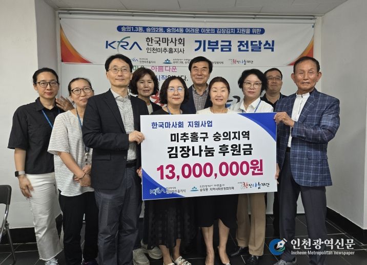 [인천광역신문] 최예준 기자 | 한국마사회 인천미추홀지사(지사장 조영진)는 미추홀구 숭의1·3동, 숭의2동, 숭의4동 일대 취약계층을 지원하기 위해 김장 나눔 후원금 1,300만 원을 학산나눔재단에 전달했다고 23일 밝혔다.