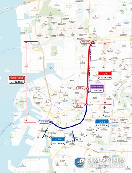 [인천광역신문] 최예준 기자 | 인천광역시는 인천대로 일반화 도로개량공사를 1-1단계인 인천기점~독배로, 1-2단계 독배로~주안산단고가교, 그리고 2단계인 주안산단고가교~서인천IC로 세분화했으며, 오는 10월 2단계 구간을 착공해 전체 사업을 본격적으로 추진한다고 밝혔다.