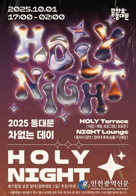 [인천광역신문] 최훈 기자 | 서울 동대문구는 오는 10월 1일 오후 5시부터 다음날 오전 2시까지 회기역 인근 회기랑길(경희대로1길 및 경희대로1가길 일대)에서 ‘2025 차없는 데이-HOLY NIGHT’ 행사를 개최한다고 밝혔다.