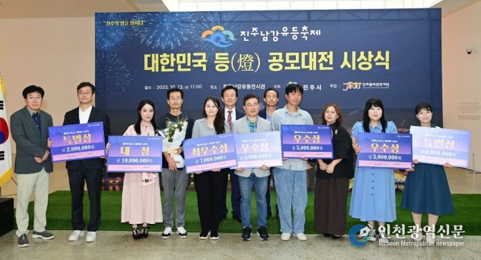 [인천광역신문] 관리자 기자 | 진주시는 13일 진주남강유등전시관에서 진주시가 주최하고 (재)진주문화관광재단과 ‘등(燈)공모대전 운영위원회’가 주관하는 ‘2025 진주남강유등축제 대한민국 등(燈)공모대전’ 시상식을 개최했다.