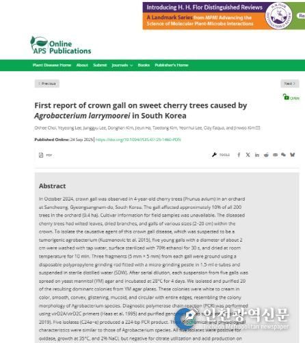이 결과 국내에서는 처음으로 체리에서 발생한 혹병(Agrobacterium larrymoorei)이 규명돼 국제 학술지(Plant Disease)에 보고됐다.