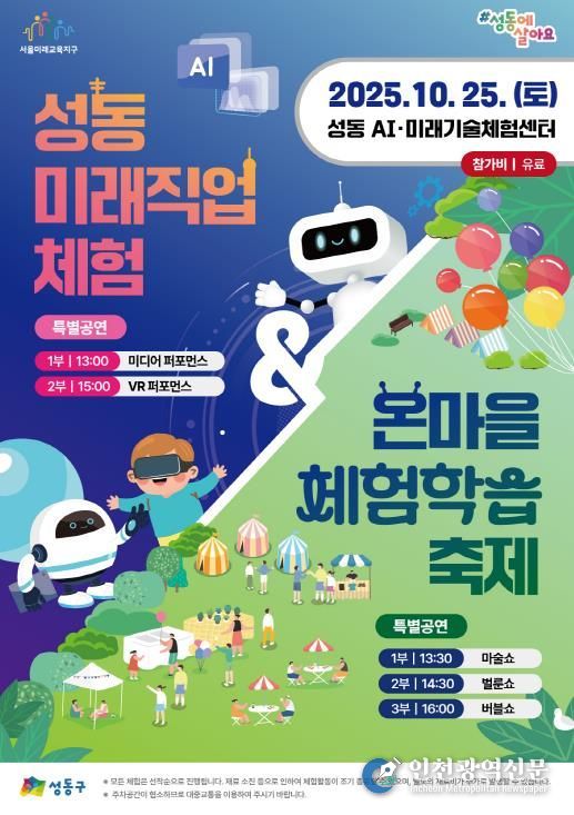 [인천광역신문] 최훈 기자 | 서울 성동구가 오는 10월 25일 성동 AI‧미래기술체험센터 일대에서 '성동 미래직업체험 · 온마을체험학습 축제'를 개최한다고 밝혔다.