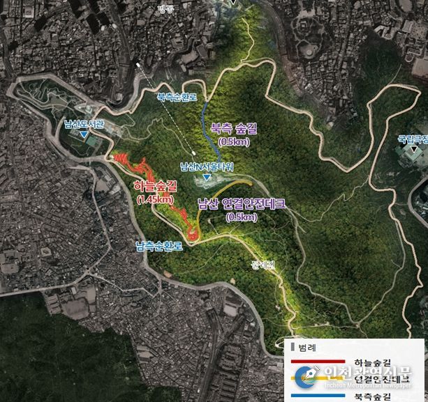 [인천광역신문] 최훈 기자 | 맑은 하늘 아래 남산의 싱그러움을 고스란히 느끼며 걸을 수 있는 산책로 하늘숲길이 드디어 열린다. 이번에 개통하는 ‘남산 하늘숲길’은 남산 체력단련장(용산구 후암동)에서 남산도서관까지 이어지는 1.45㎞ 구간으로 안정적 높이와 낮은 경사의 무장애길이다.