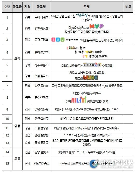 이번 공모전에는 전국 농어촌 지역에서 초등학교 47개교, 중학교 29개교 고등학교 15개교 등 총 91개교의 우수사례가 접수됐다. 1차 서면 심사와 2차 현장 실사 등을 거쳐 총 15개교(초등학교 8개교, 중학교 5개교, 고등학교 2개교)가 최종 선정됐다.