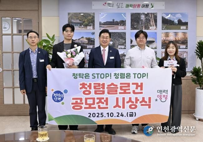 [인천광역신문] 관리자 기자 | 양평군은 지난 24일 ‘2025 청렴 슬로건 시상식’을 개최하고, 공정하고 투명한 공직문화 확산을 위해 추진한 ‘청렴 슬로건 공모전’의 수상작을 발표했다.