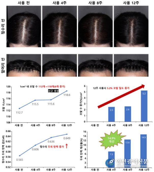 또한, 12주 후 ▲모발 밀도는 1cm2당 112.7±15.7개에서 118.6±14.9개로 5.9개(5.2%) 증가했고 ▲두피 탄력도는 14.9% 향상 ▲모발 길이는 97㎛(17.1%) 증가 ▲모발 굵기는 12㎛(12.6%) 증가하는 등 전반적인 모발 건강 지표가 고르게 향상됐다.
