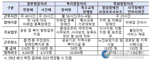 2026년 장애인일자리 지원사업(정부예산안 기준)은 2025년 3만 3,546명 대비 2,300명 확대된 3만 5,846명이며, 일반형일자리(전일제, 시간제), 복지형일자리, 특화형일자리(시각장애인안마사 파견, 발달장애인요양보호사 보조) 3개 유형으로 구분하여 시행하고 있다.