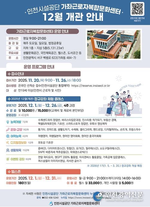 [인천광역신문] 최예준 기자 | 인천시설공단은 근로자와 시민이 함께 이용할 수 있는 복합 문화시설인 ‘가좌근로자복합문화센터’의 개관식을 26일에 개최한다.