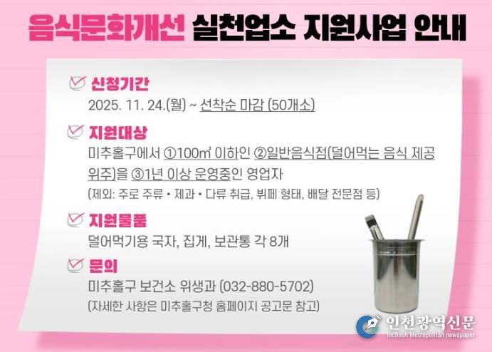 [인천광역신문] 최예준 기자 | 인천 미추홀구는 오는 24일부터 위생적이고 건강한 외식 환경 조성을 위한 ‘음식문화 개선 실천업소 지원사업’을 추진한다.