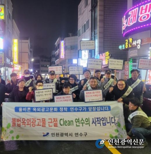 [인천광역신문] 최예준 기자 | 연수구는 지난 27일 무분별하게 설치되어 도시미관을 저해하고 주민과 방문객들의 불편 민원을 해소하기 위해 연수 1단지 상가 밀집 지역에서 불법 광고물 민·관·경 합동단속을 실시했다.