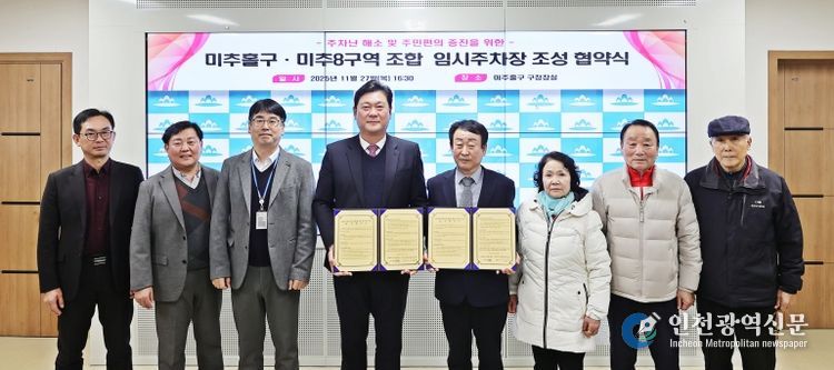 [인천광역신문] 최예준 기자 | 인천 미추홀구는 지난 27일 구청장실에서 미추8구역 주택재개발정비사업 조합과 ‘임시주차장 조성 협약’을 체결했다.
