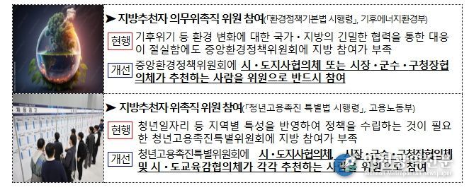 개정안의 주요사례를 보면, 중앙환경정책위원회와 같이 국가적 과제나 지방정부와 긴밀한 협력이 필수적인 정책을 논의하는 정부위원회에 지방에서 추천한 사람이 위원으로 반드시 참여하도록 제도화했다.