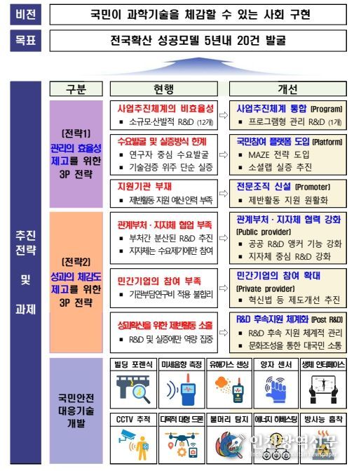 1부 연구개발 성과전과 2부 전략 공청회로 나누어 진행된 이번 행사는 먼저, 최근 종료된 국민 안전 대응 연구개발 성과 중 기술성숙도(Technology Readiness Levels, TRL)가 높은 10점의 시제품을 전시하고, 제품화를 위한 후속 지원방안을 모색하기 위해 연구자 간 경쟁 경연(오디션)과 같은 경진대회(챌린지) 방식의 발표와 민간 공익재단·벤처 캐피탈(VC) 등의 자문(컨설팅)이 이어졌다. 이를 통해, 연구 성과의 실제 활용도를 높일 것으로 기대된다.