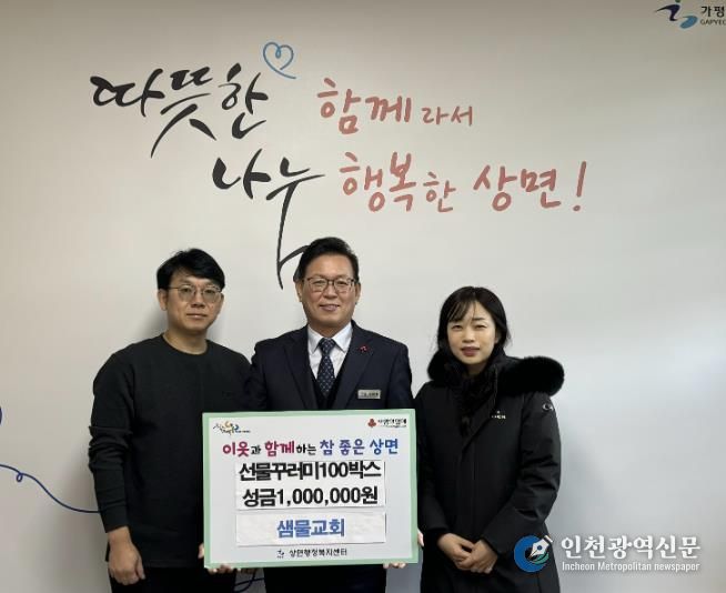 [인천광역신문] 박진 기자 | 가평군 소재 샘물교회는 18일 상면 행정복지센터를 방문해 지역의 어려운 이웃을 위해 성금 100만원과 선물꾸러미 100세트를 기탁했다.