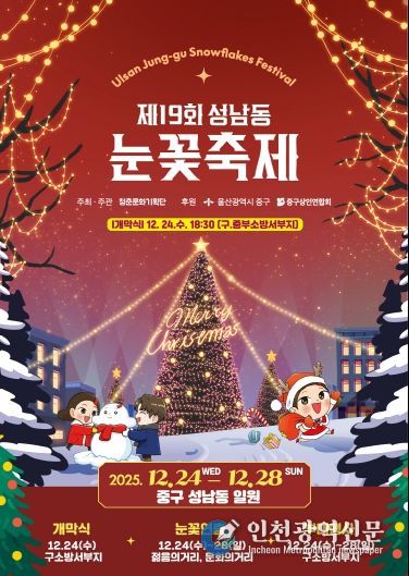 한편, 중구는 성남동 눈꽃축제와 연계해 옛 울산초등학교 앞~보세거리 입구 구간과 젊음의거리 등에 대형 성탄절 나무(크리스마스 트리), 종 모양 조형물, 2026 숫자 조형물 등을 설치해 운영하며 더욱 낭만적인 분위기를 연출할 계획이다.