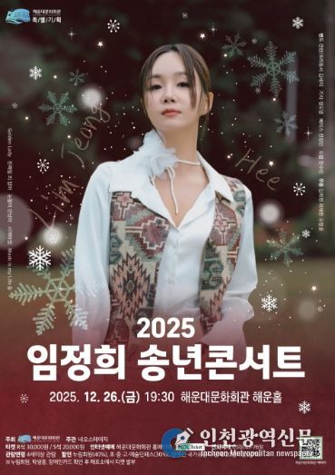 [인천광역신문] 박진 기자 | 해운대문화회관은 오는 12월 26일 오후 7시 30분, 해운대문화회관 해운홀에서 송년 특별기획 공연인 ‘2025 임정희 송년콘서트’를 개최한다.