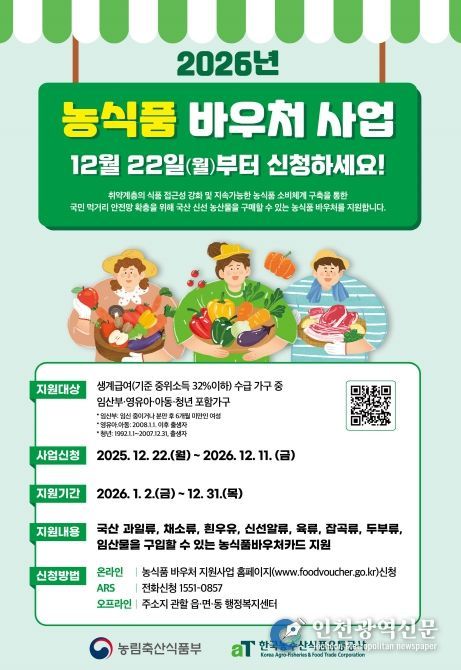 [인천광역신문] 박진 기자 | 경북도는 22일부터 생계급여 수급 가구에 온라인, 읍면동 행정복지센터 방문, ARS 전화로 2026년도 농식품바우처 카드 발급을 시작한다.