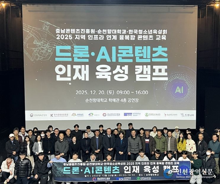 [인천광역신문] 박진 기자 | 충남콘텐츠진흥원은 순천향대학교, 한국청소년육성회와 함께 추진한 ‘드론·AI 콘텐츠 인재 육성 캠프’를 성공적으로 마무리했다고 밝혔다.
