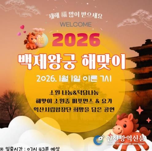 [인천광역신문] 박진 기자 | 2026년 병오년(丙午年) 새해를 맞아 익산 백제왕궁에서 첫 일출을 맞는 특별한 행사가 열린다.