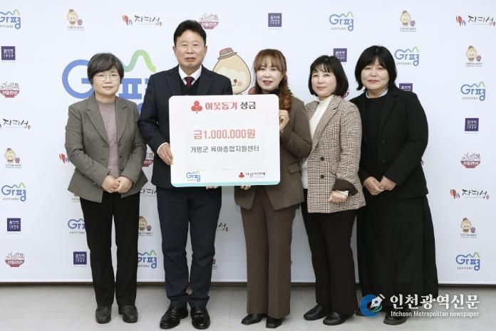 [인천광역신문] 박진 기자 | 가평군육아종합지원센터는 최근 연말을 맞아 어려운 이웃을 돕기 위해 성금 100만원을 가평군에 기탁했다.