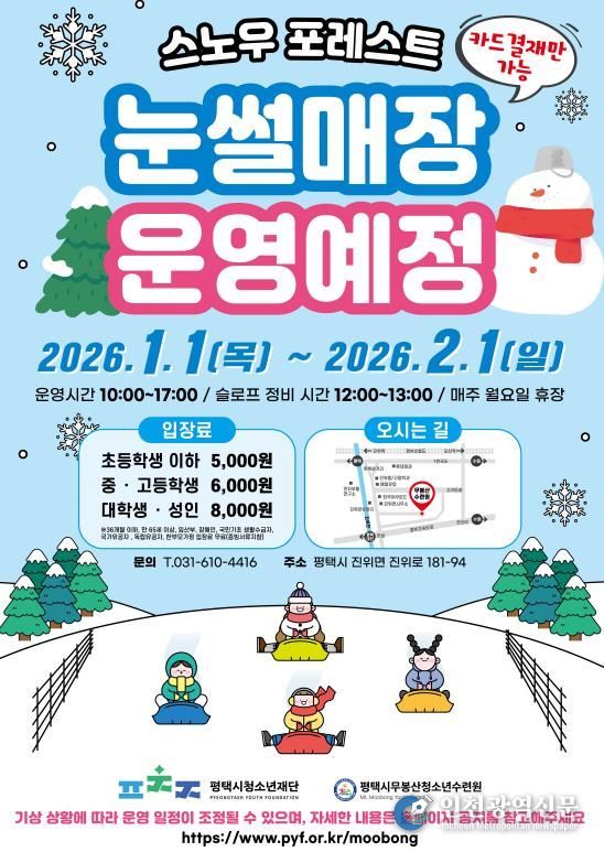 [인천광역신문] 박진 기자 | (재)평택시청소년재단 무봉산청소년수련원은 눈썰매장 ‘스노우 포레스트’를 오는 2026년 1월 1일부터 2월 1일까지 운영할 예정이라고 밝혔다.