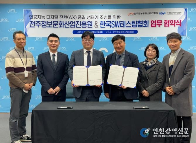 [인천광역신문] 박진 기자 | 전주시 출연기관인 (재)전주정보문화산업진흥원은 23일 진흥원 멀티미디어기술지원센터 1층 세미나실에서 사단법인 한국소프트웨어테스팅협회와 ‘인공지능 디지털 전환(AX) 품질 생태계 조성’을 위한 업무협약을 체결했다.