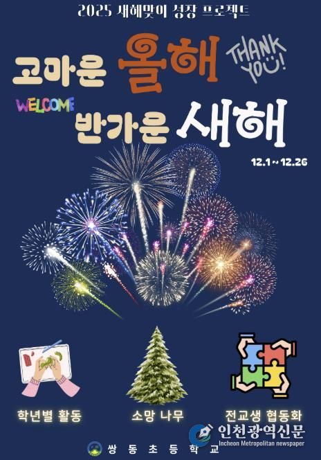 [인천광역신문] 박진 기자 | 쌍동초등학교는 연말연시를 맞아 전교생이 참여하는 ‘고마운 올해, 반가운 새해’ 새해맞이 성장 프로젝트를 진행했다. 학생들은 한 해를 돌아보고 감사의 마음을 표현하며, 새해 목표를 시각적으로 드러내는 다양한 활동을 경험했다.