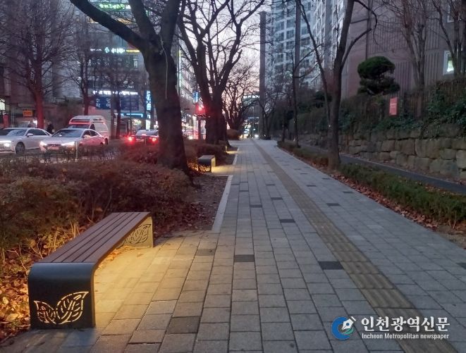 구는 설계 단계부터 주민들의 의견을 반영해 밤에도 아름다운 거리 분위기를 연출하고, 보행자 안전성 강화를 위하여 벤치 아래 은은한 조명등을 설치했다.