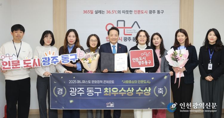 [인천광역신문] 박진 기자 | 광주 동구는 2025 매니페스토 문화정책 콘체르토에서 ‘문화활동 활성화 분야’ 최우수상을 최근 수상했다고 밝혔다. 수상 사례는 ‘365일 36.5℃ 인문도시 광주 동구’ 정책이다.
