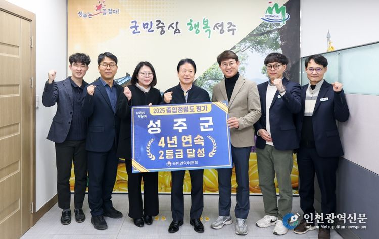 [인천광역신문] 박진 기자 | 성주군은 국민권익위원회 주관 ‘2025년 공공기관 종합청렴도 평가’에서 2등급을 받아 4년 연속 종합청렴도 2등급을 달성했다.