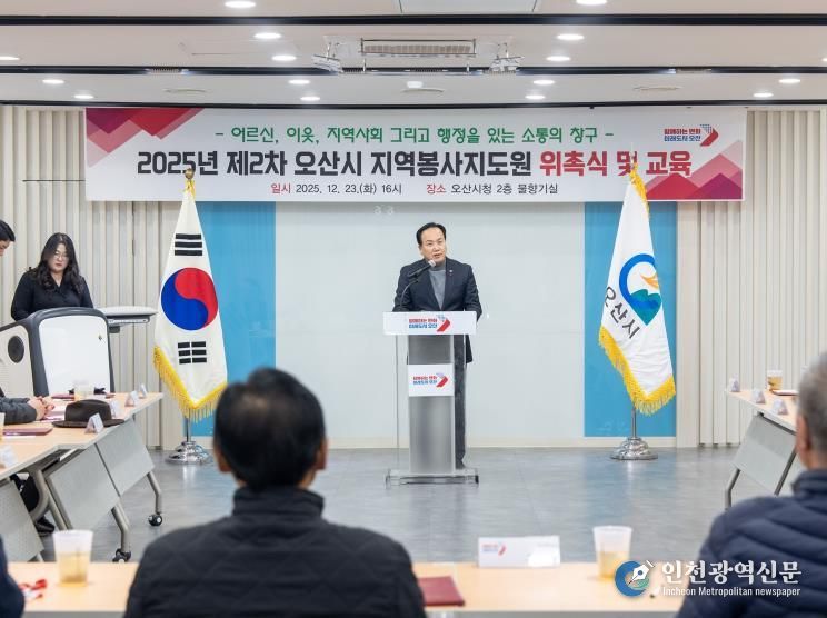 [인천광역신문] 박진 기자 | 오산시는 지난 23일 오산시청 물향기실에서 신규 경로당 회장을 대상으로 한 '2025년 지역봉사지도원 위촉식'을 개최했다고 밝혔다.