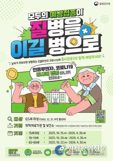 이번 절기 인플루엔자 예방접종은 65세 이상 어르신, 임산부, 어린이를 대상으로 실시되며, 코로나19 예방접종은 65세 이상 어르신, 면역저하자 및 감염취약시설 입소자를 대상으로 실시하고 있다.