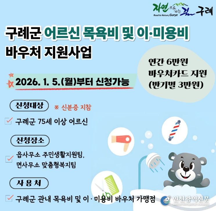 [인천광역신문] 박진 기자 | 구례군은 75세 이상 어르신들의 건강하고 활기찬 노후생활 보장과 지역경제 활성화를 도모하기 위해 '어르신 목욕비 및 이·미용비 바우처 지원사업'을 본격 추진한다고 밝혔다.